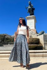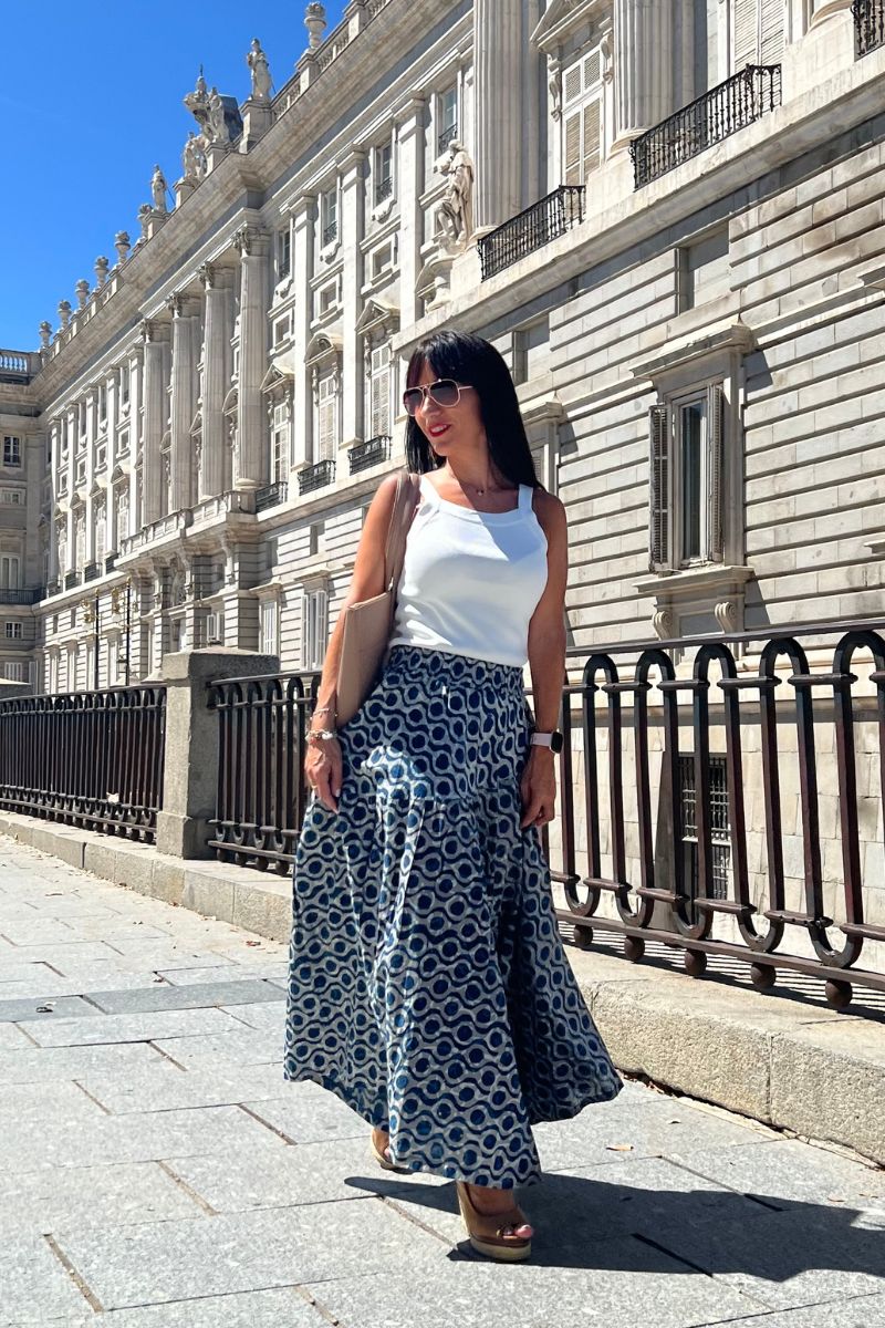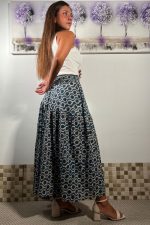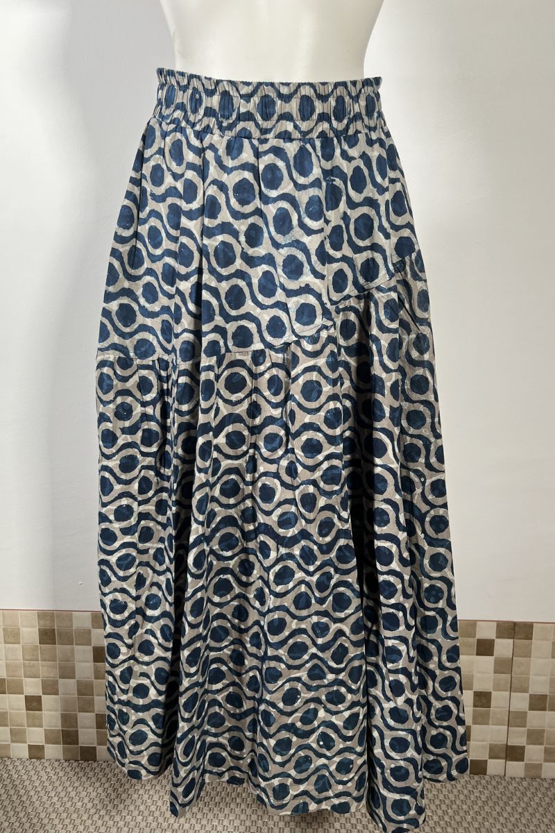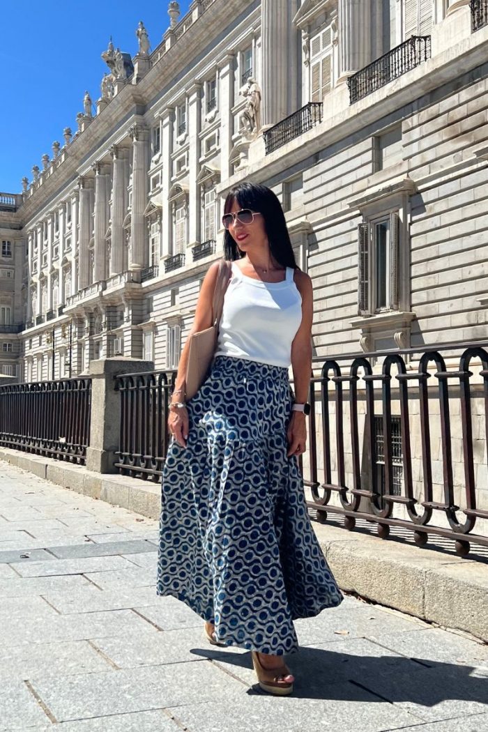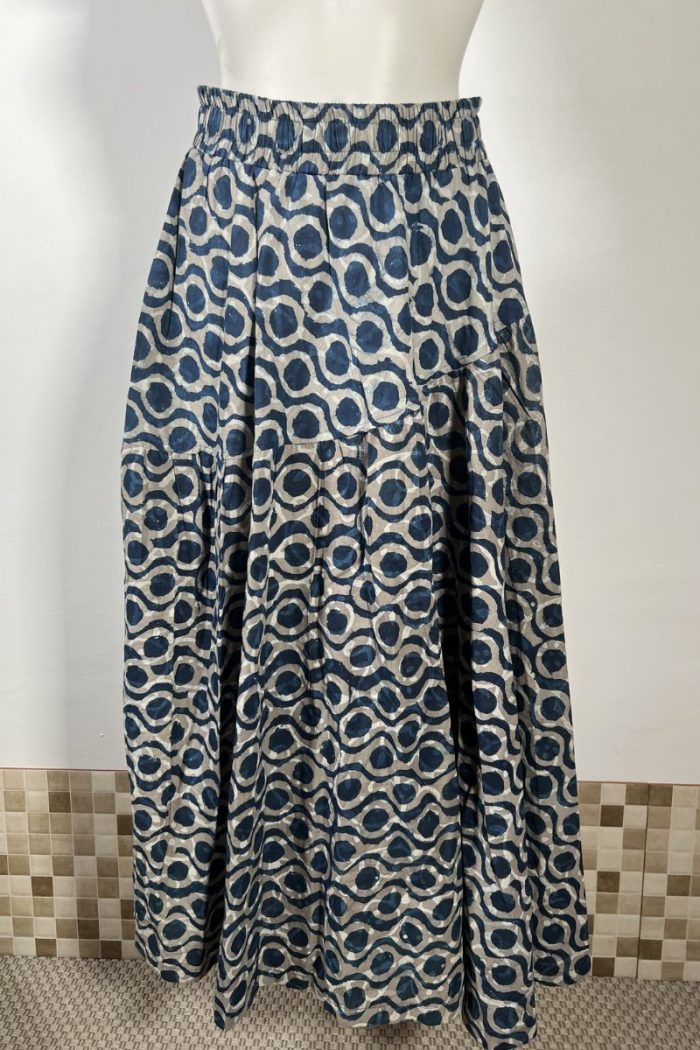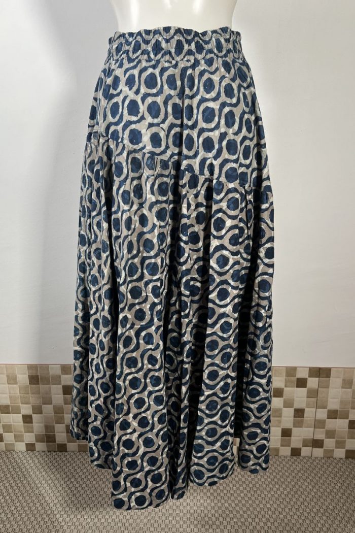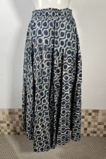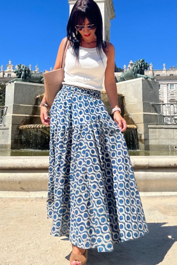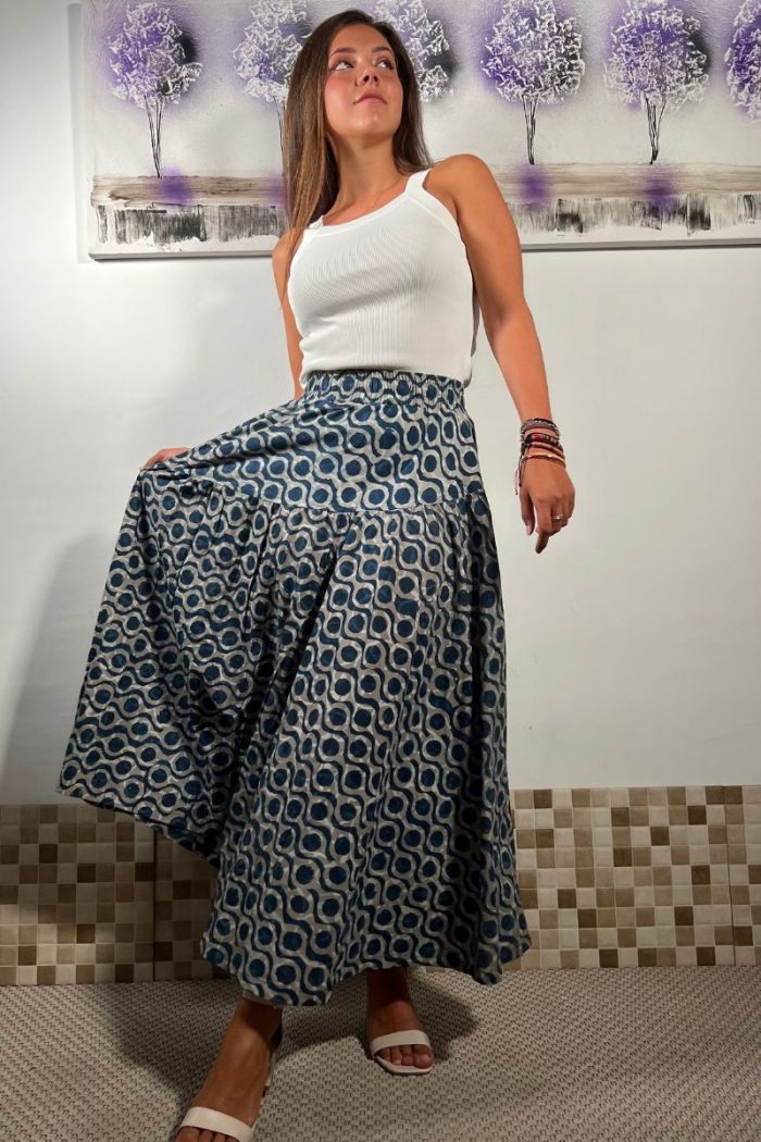 El estampado bohemio de la Falda Indiana lleva consigo la riqueza de los excepcionales tintes naturales, como el índigo para el azul, que dan vida a colores pronunciados y vibrantes. Cada detalle refleja la artesanía y la tradición textil de la India, creando una obra maestra única en su clase.