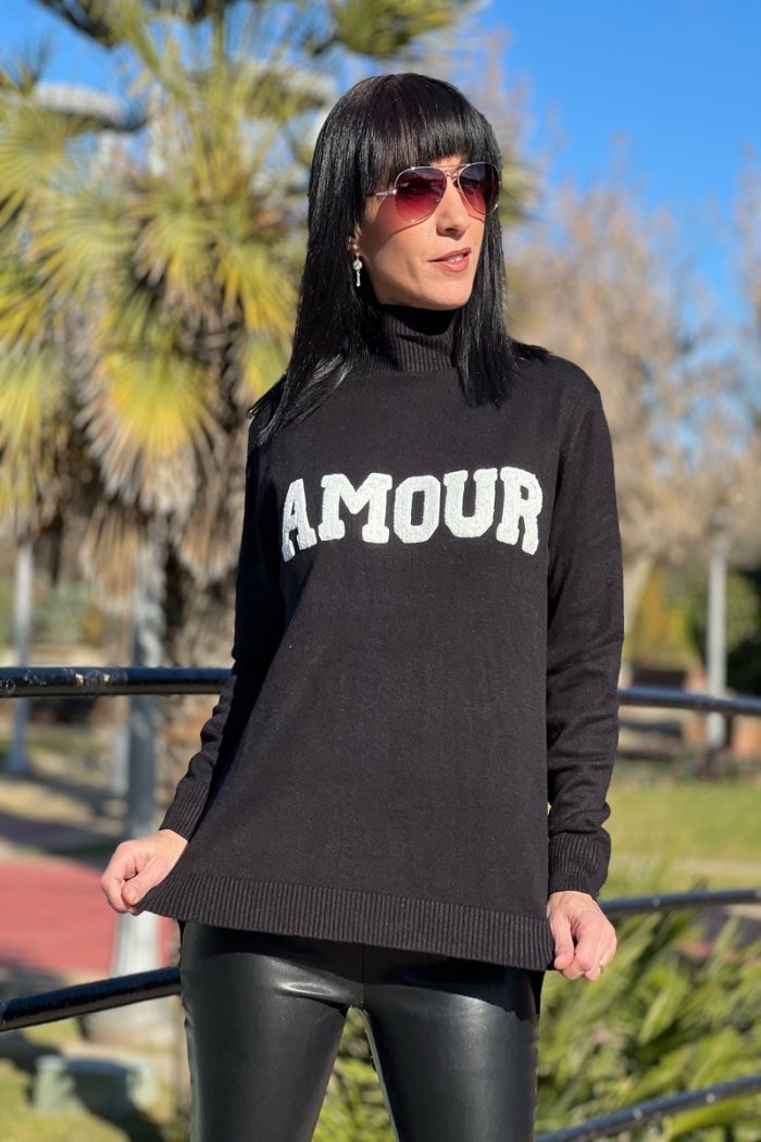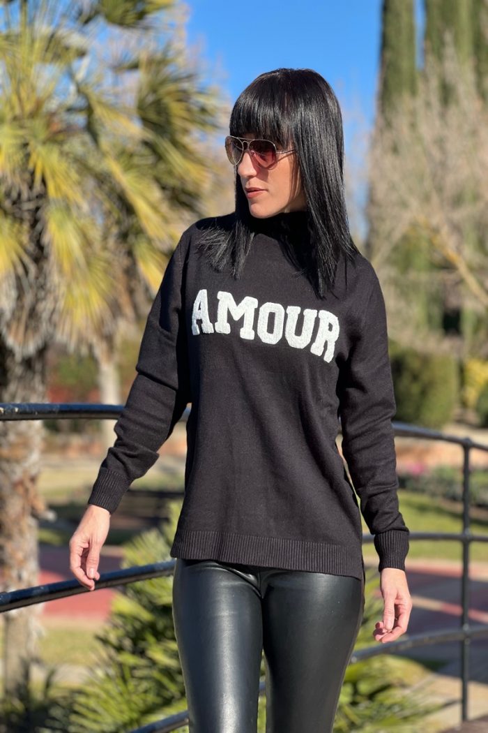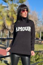 Jersey de manga larga en un elegante color negro, perfecto para cualquier ocasión. En el pecho, destaca la palabra “amour” en un bonito color blanco, que le da un toque moderno y romántico. Está confeccionado con una mezcla de materiales que lo hacen muy cómodo: 50% viscosa, que aporta suavidad; 22% poliamida, que le da resistencia; y 28% poliéster, que ayuda a mantener su forma. Es una prenda versátil que puedes combinar fácilmente con diferentes estilos. ¡Ideal para lucir bien y sentirte genial!