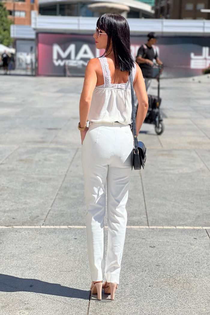Pantalón largo de pernera estrecha con cinturón y bolsillos laterales, abrocha con botón y cremallera.