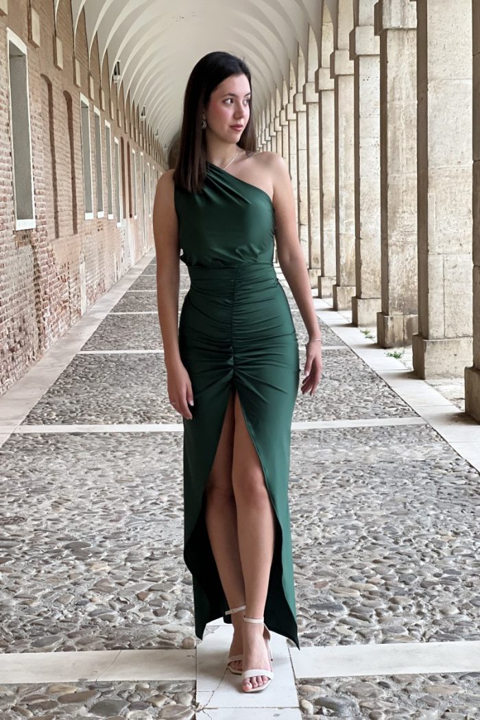 Vestido largo de ceremonia, escote asimétrico, fruncido y abertura en la parte frontal, parte trasera lisa.