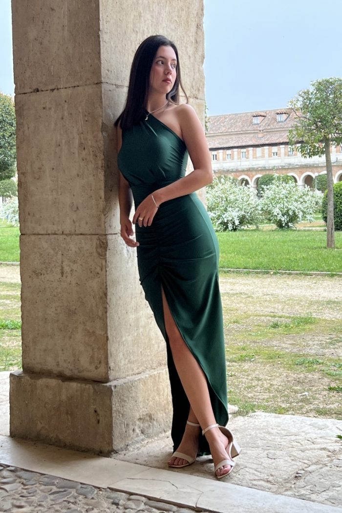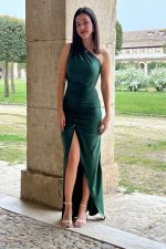 El Vestido Esmeralda te envuelve en un aura de glamour y sofisticación con su exquisito diseño. Su escote asimétrico añade un toque de modernidad y originalidad, mientras que el fruncido delicado en la parte frontal crea pliegues suaves que realzan tu silueta con elegancia y feminidad.